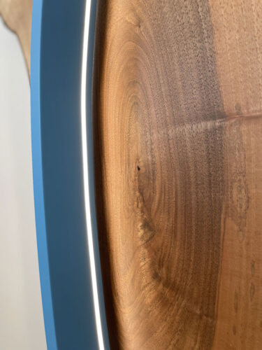 Geschwungene und gespiegelte Walnuss mit blauer Welle. Beidseitig in die Welle eingelassene LED-Bänder sorgen für den außergewöhnlichen Lichteffekt. Wandleuchte aus dem Hause LichtQunst.