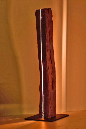 Mittig aufgetrennt und beidseitig mit LED-Bändern hinterlegt wirft die Skulptur eiche_16 zwei klar konturierte Lichtstreifen auf Boden und benachbarte Wände.