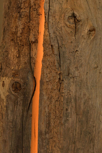 archaische Eiche, krumm, grob behauen, mit labyrintischen Gängen von (ausgeflogenen) Insekten auf Nahrungssuche.