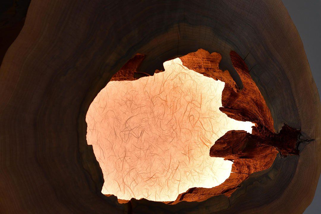 Querschnitt eines Walnussbaums mit Faulkern. Der fehlende Kern ist mit beleuchtetem, stark strukturiertem Japanpapier hinterlegt. Durch den Abstand zwischen Japanpapier und Nussbaumscheibe entsteht ein schmaler Lichtstreifen im Raum.