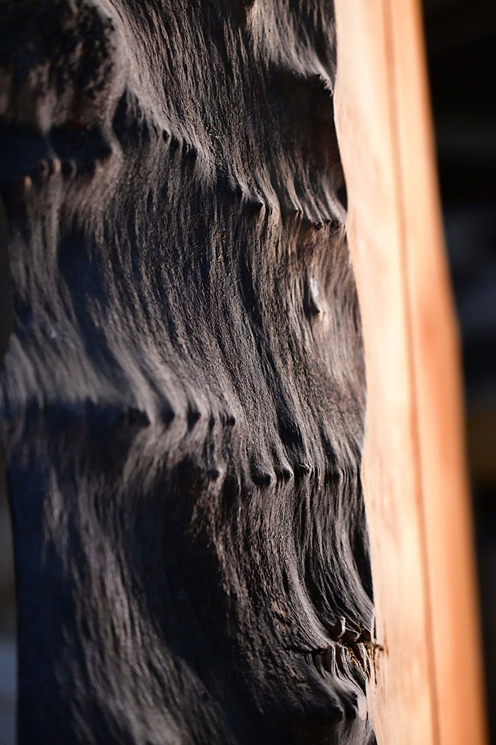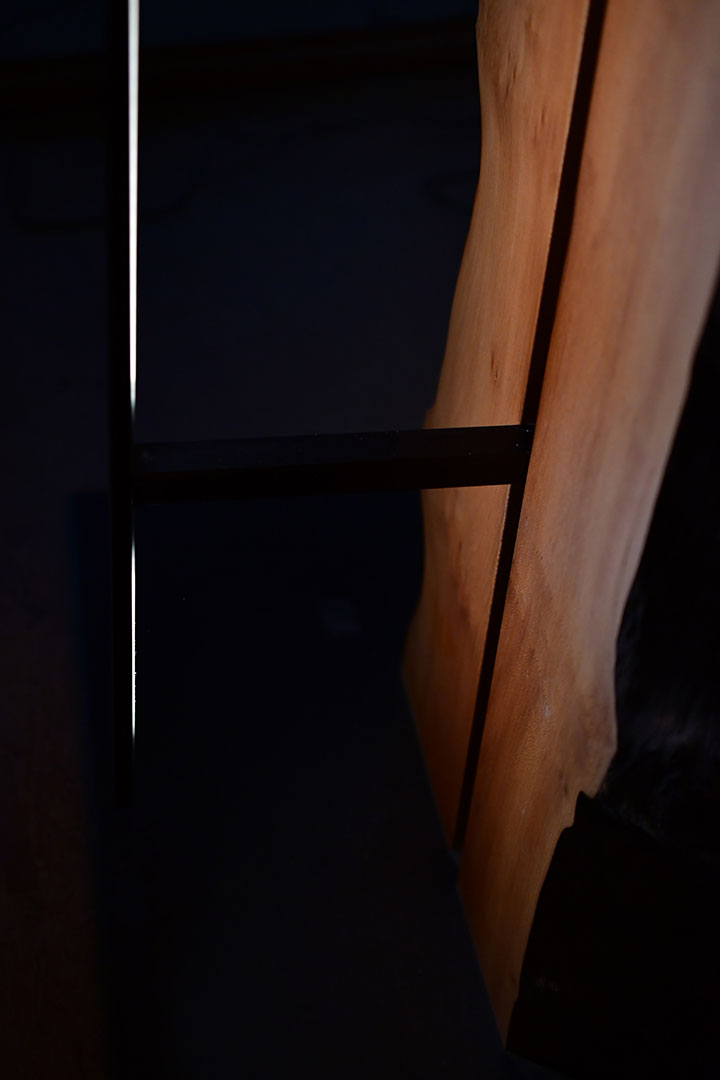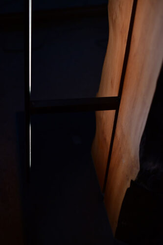 Ein LED-Streifen mit warmweißem Licht, eingebettet in ein schwarzes Aluminiumprofil mit transluzenter Acrylabdeckung. Gegenüber eine stolze Platane mit ausgeprägter Waldkante, die sich konsequent bis in die Spitze zieht. Die warm-rötliche Farbe und die außergewöhnliche Maserung der Platane werden mit dem Betätigen des auf der Rückseite eingelassenen Schalters zu vollem Leben erweckt.